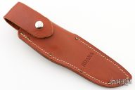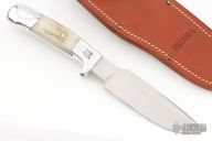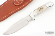 This Custom Finn made by Ruana features a satin finished blade with false top edge and notched thumbrest, .165" blade stock and 1.222" blade depth, hidden tang construction. The handle is cast aluminum with elk inlays. Comes with brown leather sheath. Has one small oxidation spot near the thumbrest, otherwise excellent condition.
