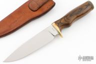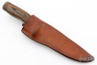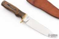 This Model 158 Outdoorsman by Smith & Wesson features a polished drop point blade, .234" blade stock and 1.292" blade depth, hidden tang construction. The handle is comprised of a brass guard and threaded and pommel with a dymondwood grip. Includes original leather sheath with belt loop. Has a couple light scratches and a small nick in the blade edge, otherwise good condition. #2122