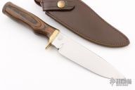 This Model 158 Outdoorsman by Smith & Wesson features a polished drop point blade, .234" blade stock and 1.364" blade depth, hidden tang construction. The handle is comprised of a brass guard and pommel with a dymondwood grip. Includes original leather sheath with belt loop. Has a couple light scratches, otherwise excellent condition. #5299