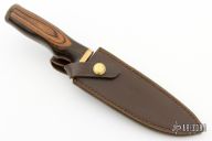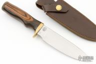 This Model 158 Outdoorsman by Smith & Wesson features a polished drop point blade, .236" blade stock and 1.375" blade depth, hidden tang construction. The handle is comprised of a brass guard and pommel with a dymondwood grip. Includes original leather sheath with belt loop. Has some light scratches, otherwise excellent condition. #8638