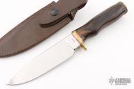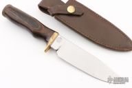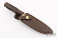 This Model 158 Outdoorsman by Smith & Wesson features a polished drop point blade, .236" blade stock and 1.398" blade depth, hidden tang construction. The handle is comprised of a brass guard and pommel with a dymondwood grip. Includes original leather sheath with belt loop. Has some light scratches, otherwise excellent condition. #3561