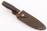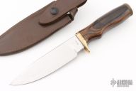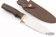 This Model 158 Outdoorsman by Smith & Wesson features a polished drop point blade, .236" blade stock and 1.398" blade depth, hidden tang construction. The handle is comprised of a brass guard and pommel with a dymondwood grip. Includes original leather sheath with belt loop. Has some light scratches, otherwise excellent condition. #9506