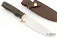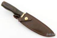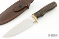 This Model 158 Outdoorsman by Smith & Wesson features a polished drop point blade, .236" blade stock and 1.398" blade depth, hidden tang construction. The handle is comprised of a brass guard and pommel with a dymondwood grip. Includes original leather sheath with belt loop. Has some light scratches, otherwise excellent condition. #13422