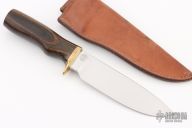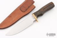 This Model 158 Outdoorsman by Smith & Wesson features a polished drop point blade, .236" blade stock and 1.398" blade depth, hidden tang construction. The handle is comprised of a brass guard and pommel with a dymondwood grip. Includes original leather sheath with belt loop. Has some light scratches, missing the brass butt cap, otherwise good condition. #13184