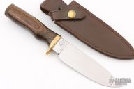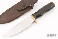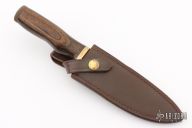 This Model 158 Outdoorsman by Smith & Wesson features a polished drop point blade, .236" blade stock and 1.398" blade depth, hidden tang construction. The handle is comprised of a brass guard and pommel with a dymondwood grip. Includes original leather sheath with belt loop. Has scratches, has been used, otherwise good condition. #4561