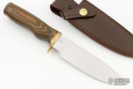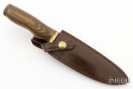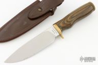 This Model 158 Outdoorsman by Smith & Wesson features a polished drop point blade, .236" blade stock and 1.398" blade depth, hidden tang construction. The handle is comprised of a brass guard and pommel with a dymondwood grip. Includes original leather sheath with belt loop. Has scratches and some oxidation spots, otherwise good condition. #15074
