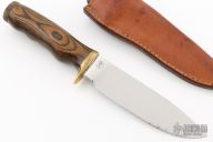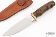 This Model 158 Outdoorsman by Smith & Wesson features a polished drop point blade, .236" blade stock and 1.398" blade depth, hidden tang construction. The handle is comprised of a brass guard and pommel with a dymondwood grip. Includes original leather sheath with belt loop. Has scratches and some oxidation spots, otherwise good condition. #15074