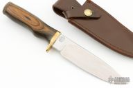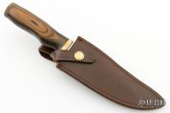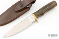 This Model 158 Outdoorsman by Smith & Wesson features a polished drop point blade, .236" blade stock and 1.279" blade depth, hidden tang construction. The handle is comprised of a brass guard and pommel with a dymondwood grip. Includes original leather sheath with belt loop. Has scratches and has been resharpened, otherwise good condition. #7353