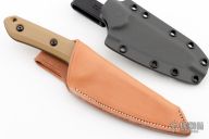 This knife features a brown cerakote blade with a notched thumbrest and a full tang construction.  The handle features tan G-10 Scales. Includes original box, brown leather sheath, kydex sheath and COA.Has a couple light scratches, otherwise excellent condition.
