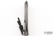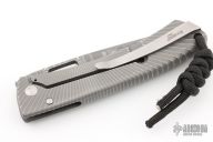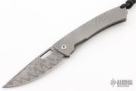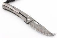 This frame-lock folder features a Damascus spear point blade with square thumb-hole and notched thumb-rest. The handle has a polished and milled integral titanium frame with tip up stainless steel clip. Has a very strong detent, perfect blade seating and lockup. Comes with zipper case. Excellent condition.