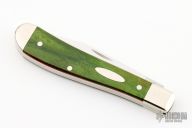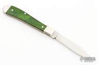 This Dogleg Trapper Mike Alsdorf features a mirror finished clip point blade with nail nick. The handle has nickel silver bolsters, green bone covers, nickel silver escutcheon and pins, stainless steel spring. Includes leather slip pouch. Excellent condition. Dated 2007.