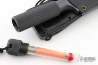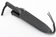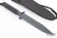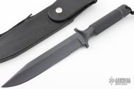 The Project II (clip point blade) was designed in conjunction with Sgt. Karl Lippard, USMC and author of The Warriors - United States Marines. The concept was to fulfill all the features which Sgt. Lippard felt were vital for a knife carried by a Marine. The 7.5 blade (.255" thick at spine) is perfect for chopping, digging and cutting, with sufficient weight up front for maximum strength and ideal balance. The wave serrations on the cutting edge are designed to cut easily through nylon cord or harness. Comes with original black leather sheath. Has some light scuffs, otherwise excellent condition.