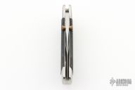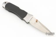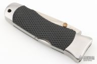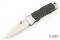 This Vintage lock back by SOG features a satin finish blade with false top edge and dual thumbstuds. The handle has satin finished stainless steel bolsters, liners and backspacer, checkered rubber scales, custom fitted tip down stainless steel clip. Strong lock up. Excellent condition.