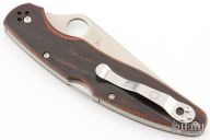 This Police from Spyderco features a satin finished clip point HAP40/SUS410 San Mai blade with swedge, thumb hole and notched thumb ramp. The handle has pakkawood scales over steel liners and backspacer. The stainless steel pocket clip is 4 way adjustable. Includes original box. and papers. Excellent condition.