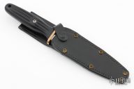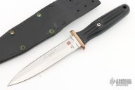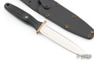 This Applegate-Fairbairn Combat Dagger from Al Mar Knives has a mirror polished double edged blade with .171" blade stock and 1.079" blade depth, hidden tang construction. The handle is comprised of a brass double guard and black zytel handle. Lanyard Hole in pommel. Excellent condition. Includes a black leather sheath with belt loop.