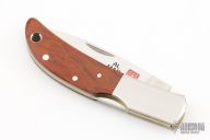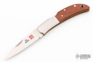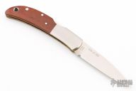 This Hawk by Al Mar features a satin finished blade with nail nick. The handle has stainless steel bolsters, cocobolo scales, brass liners, stainless steel backspacer. Comes with original box and leather slip sheath. Excellent condition.