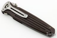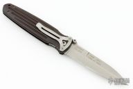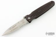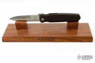 This Applegate Fairbairn Combat Folder by Gerber Legendary Blades has a tumble finished double edged blade with dual thumb studs, notched thumbrest and false top edge. Handle is green canvas micarta with single stainless steel liner and lanyard hole, tip down tumbled stainless steel clip. Numbered 1390 of 1500. Comes with original box, papers, and wooden stand. Excellent condition.