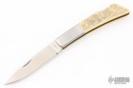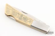 This Silver Knight by Gerber features a mirror polished drop point blade with nail nick. The handle has stainless steel bolsters, scrimshawed ivory paper micarta scales, brass liners, and a stainless steel backspacer. The scrimshaw was done by Boucher. Excellent condition. Comes with original box.