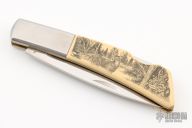 This Silver Knight by Gerber features a mirror polished drop point blade with nail nick. The handle has stainless steel bolsters, scrimshawed ivory paper micarta scales, brass liners, and a stainless steel backspacer. The scrimshaw was done by Boucher. Excellent condition. Comes with original box.