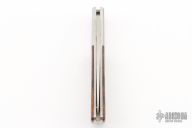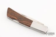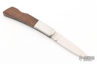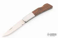 This Silver Knight by Gerber features a satin finished drop point blade with nail nick. The handle has stainless steel bolsters, wood scales, brass liners, and a stainless steel backspacer. Excellent condition. Comes with original box.