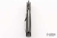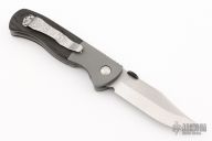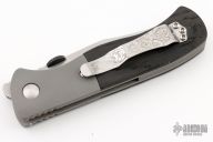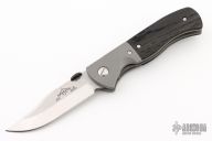 This PoBoy EX-100 from Emerson Knives features a stonewashed blade with knurled zirconium thumbdisc and notched thumbrest. The handle has bead blasted and dovetailed titanium bolsters, bog oak scales, titanium liners and backspacer, tip up laser engraved stainless steel clip. Comes with original box and papers. Has a couple light scuffs, otherwise excellent condition.