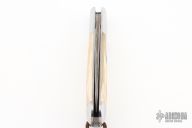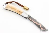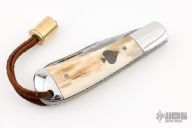This Small Bronc by Mike Rothman features a Baker's Forge Copper San Mai Damascus blade with nail nick. The handle has mirror polished 416 stainless steel bolsters with integral liners, mammoth ivory covers with a carbon fiber spade escutcheon, jeweled liners, and a CPM154 spring. Has half-stop, flush in all positions. Has a 30-30 shell casing bead. Comes with zippered case and COA. New from maker!