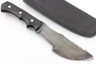 This is a WSK Tracker made by Dave Beck. It features a blued and hand rub satin finished blade with self-cleaning sawteeth on blade spine. Black linen micarta scales with white liners. Full tapered tang construction with .242" blade stock and 2.379" blade depth. Includes original Dave Beck black leather sheath. New from maker.