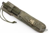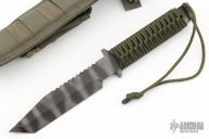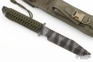 This BTSS from Mick Strider features a tiger stripe clip point tanto style blade with serrations on the spine, .255" blade stock and 1.308" blade depth. The handle is comprised of green paracord wrap over full tang construction with a lanyard hole. Includes nylon sheath with belt loop. New condition.