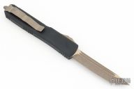 From the Microtech Exclusive collection, the Microtech Spartan offers a refined design that is rugged enough for EDC while maintaining a unique collectible look. The Spartan's blade is marked with the Greek phrase Molon labe, meaning "come and take them", a classical expression of defiance. Bronzed hardware, blade and clip add a classic finishing touch to the design. This Spartan model features a tanto blade with a bronzed finish. Microtech equipped this version of the ever popular Ultratech D/A OTF knife with a smooth, contoured handle design that promotes increased comfort during use. This updated model provides the same dimensions, hardware, and durability offered by the "Tri-Grip" variation, but goes easier on the hands and pockets. For those unfamiliar with the Ultratech, it's a fully automatic knife with a double-action out-the-front mechanism, meaning the thumb slide deploys the blade and retracts it as well. The Ultratech knife from Microtech has set the bar for all OTF knives. New condition with original box and papers. Dated 03/2019
