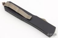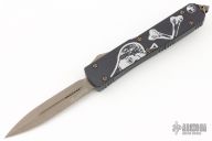 This Ultratech OTF from Microtech features a tanto blade profile and a collectible death card graphic. The blade has a durable bronze apocalyptic finish and a Memento Mori stamp. This model depicts the right half of the Death Card. Microtech equipped this version of the ever popular Ultratech D/A OTF knife with a smooth, contoured handle design that promotes increased comfort during use. This updated model provides the same dimensions, hardware, and durability offered by the "Tri-Grip" variation, but goes easier on the hands and pockets. For those unfamiliar with the Ultratech, it's a fully automatic knife with a double-action out-the-front mechanism, meaning the thumb slide deploys the blade and retracts it as well. The Ultratech knife from Microtech has set the bar for all OTF knives. Excellent condition with original box and papers. Dated 10/2016 and s/n 00003
