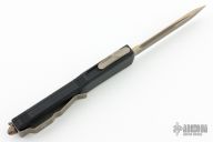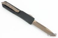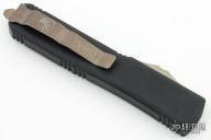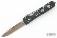 This Ultratech OTF from Microtech features a tanto blade profile and a collectible death card graphic. The blade has a durable bronze apocalyptic finish and a Memento Mori stamp. This model depicts the left half of the Death Card. Microtech equipped this version of the ever popular Ultratech D/A OTF knife with a smooth, contoured handle design that promotes increased comfort during use. This updated model provides the same dimensions, hardware, and durability offered by the "Tri-Grip" variation, but goes easier on the hands and pockets. For those unfamiliar with the Ultratech, it's a fully automatic knife with a double-action out-the-front mechanism, meaning the thumb slide deploys the blade and retracts it as well. The Ultratech knife from Microtech has set the bar for all OTF knives. Excellent condition with original box and papers. Dated 07/2019