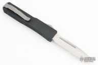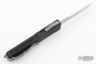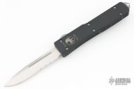 This Ultratech OTF automatic features a satin finished blade with a partially serrated edge. Stainless steel clip. Glass breaker. Serial number 00228 and dated 06/2005. Comes with a Microtech sheath. Excellent condition.