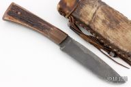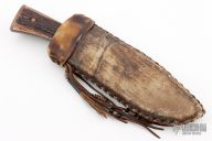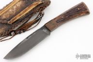 This Knife by Daniel Winkler features a drop point blade forged from an old file, fileworked thumbrest, .189" blade stock and 1.031" blade depth, full tapered tang construction. The handle has dovetailed copper bolsters and butt, stag scales with copper pins. Comes with a raw hide leather sheath. Excellent condition.