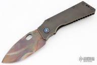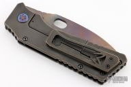 This knife has a S35VN vulcan finish blade with notched thumbrest. The custom finish on the blade features the Medford Knife and Tool logo etched on one side. The handle has bronze PVD frame and matching tip up clip. Nice detent, lockup and blade seating. Includes original box, papers and Medford Knife and Tool dog tag. Excellent condition.
