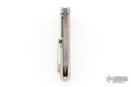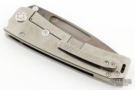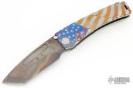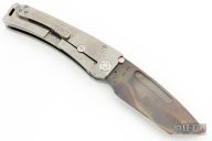 This Marauder by Medford Knives features a vulcan finished drop point tanto blade with fullers. The handle has a laser engraved titanium frame with D2 skull crusher at the butt, anodized hardware and tip up clip. Nice detent, lockup and blade seating. Comes with original box, case and papers. Excellent condition.