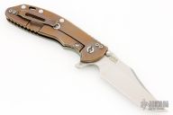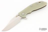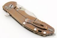 This XM-24 by Rick Hinderer features a tumble finished clip point blade with swedge, dual thumb studs, notched thumb rest and flipper. The handle is comprised of a textured G-10 scale over titanium liner on the "A" side and a tumbled titanium and anodized lock side over titanium barrel spacers. The tumbled titanium pocket clip is reversible for tip up/down, right hand carry. Excellent condition.
