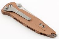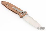 This Manual Socom Liner lock by Microtech features a satin finished blade. The handle is Tan anodized with non-slip inlay's. Perfect detent, lock up and seating. Tip down carry. Comes with a black tactical nylon belt sheath. In original box with paperwork. Has a couple scuffs on the clip, otherwise excellent condition Dated 03/2019 #3950.