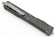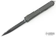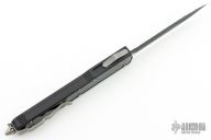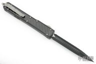 This Makora II OTF automatic by Microtech features a black double edge blade with one fully serrated edge. The handle has carbon fiber inserts on both sides of the black aluminum handle. Black coated stainless steel clip, blasted hardware and glass breaker. Dated 03/2011 and serial number 02567. Includes nylon sheath.  Excellent Condition.