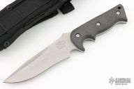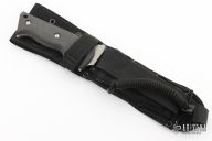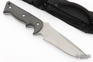 This Prototype War Blade by Walter Brend features a stonewash finished hand ground blade with notched thumbrest, .266" blade stock and 1.738" blade depth, full tang construction. The handle has carbon fiber scales with lanyard hole. Comes with black Spec-Ops sheath and original box. Marked "Prototype 011" and dated 06/12. Excellent condition.