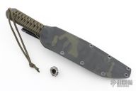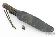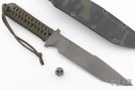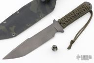 This custom fighter by John Gonzalez himself, features a dark stonewashed blade with false top edge, .201" blade stock and 1.531" blade depth, full tang construction with green paracord wrap. Comes with kydex sheath, original box and custom bead. Excellent condition.