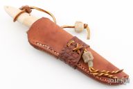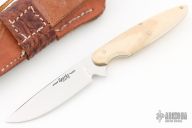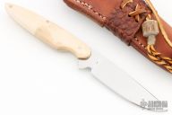 This hunter by Bernard Sparks features a mirror polished drop point blade, .115" blade stock and .829" blade depth, full tapered tang construction. The handle has mammoth ivory scales. Includes a brown leather sheath. Has a couple light scratches,otherwise excellent condition.