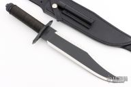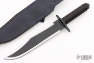 This knife features a two-tone blade with black center and mirror polished grinds, 14 saw-teeth on blade spine and sharpened top edge, .258" blade stock and 1.825" blade depth, hidden tang construction. The handle has a black stainless steel double guard with flat and Phillips head screwdrivers, hollow cord wrapped handle, and aluminum removable butt cap with a compass and an O-ring to make it waterproof. Comes with black leather sheath with a diamond sharpener in the sheath and a Lile zippered case. The blade is stamped 073. Designed by Jimmy Lile and made by Vaughn Neeley. New From Maker!