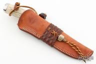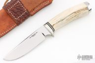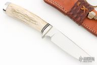 This hunter by Bernard Sparks features a mirror polished drop point blade, .245" blade stock and 1.119" blade depth, hidden tang construction. The handle has a nickel silver guard, stag grip with stainless steel butt and black/white spacers.  Includes a brown leather sheath. Excellent condition.