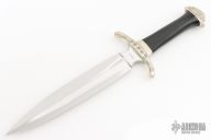 This Toothpick Dagger by Bernard Sparks features a mirror polished double edged blade, .245" blade stock and 1.410" blade depth, hidden tang construction. The handle has an engraved nickel silver guard and butt with a black linen micarta grip.  Includes a letter of athenticity from Sparks Handmade Knives stating that this knife was made before 1974. Excellent condition.