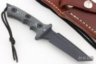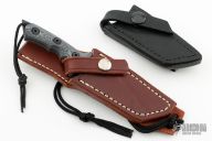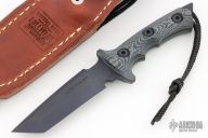This Mini Ultra Phalanx has a black tanto blade with false top edge and full tang construction, .128" blade stock, .825" depth. Handle is textured black/white G-10 scales and extended tang-butt glass breaker and lanyard. Includes a custom brown leather sheath by Sullivans, and a black leather sheath by Green River Leather. Has a couple light scuffs, otherwise excellent condition.