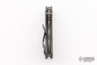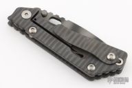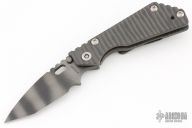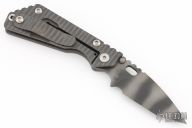 This PT by Mick Strider features a tiger striped blade with notched thumbrest and thumbhole. The handle has a flame finished titanium frame with matching tip up clip. Excellent condition.