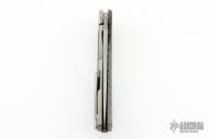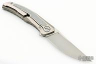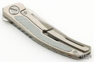 This UniQuantum by Shirogorov and Chris Reeve Knives features a two-tone blade with notched thumbrest and flipper. The handle has a blue Alutex front scale with titanium overlay with unique graphic by Reeve Knives, titanium frame with blue Alutexs inlay, titanium backspacer and tip up clip with hidden screws. Rides on SRRBS, nice detent, lockup and blade seating. Comes with original box and COA. Excellent condition. 1 of 10.