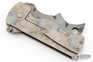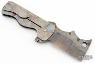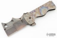 This Large Zombie Killer by RichMade Knives features a dark tumbled cleaver style blade with rock pattern flats and a flipper. The handle has an anodized and textured titanium frame with a matching tip up clip. Great blade seating, detent and lock up, rides on bearings. Includes a zippered case and COA dated 08-2022. Excellent condition.
