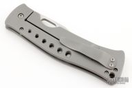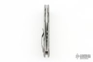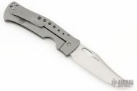 This Moran style framelock folder by Tom Mayo features a hand-rubbed satin finished blade with thumbhole and false top edge. The handle has a bead blast titanium frame. Titanium clip, tip up carry. Smooth action. Nice blade seating, detent and lockup. Excellent work. Comes with nylon velcro case. Has a scuff on the clip, otherwise excellent condition.