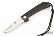 This Lockback Folder by Jimmy Lile features a satin finished blade with dual brass thumbstuds. The handle has black linen micarta scales, bras liners and a stainless steel backspacer. Nice blade seating. Has some light scratches, otherwise good condition for its age. Comes with a zippered case.